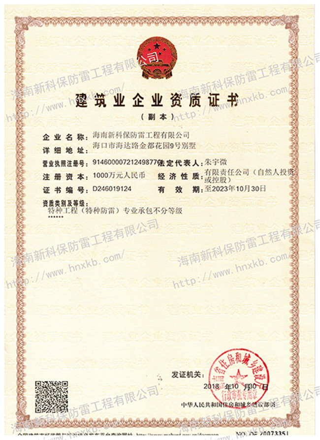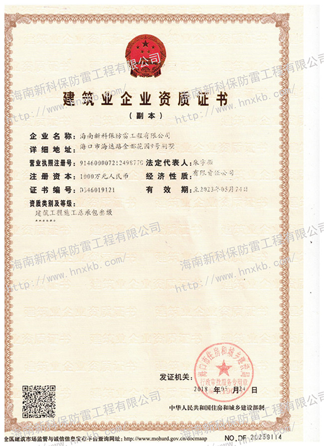海南新科保防雷工程有限公司是一家集防雷技術(shù)研究、防雷檢測、防雷工程設(shè)計施工、安防監(jiān)控工程設(shè)計施工、建筑智能化施工、建筑水電施工于一體的高科技公司。在相關(guān)主管部門監(jiān)管下,致力于為客戶提供專業(yè)的安全防護、建筑智能化、水電技術(shù)等優(yōu)質(zhì)產(chǎn)品和工程服務(wù)。